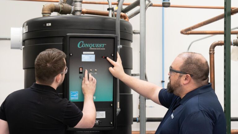 The Conquest water heater is perfect for restaurants and similar businesses, offering a compact, durable design with exceptional fuel savings. Made with corrosion-resistant AquaPLEX,, it outlasts traditional heaters, boasting warranties 3-5 times longer. Its condensing firetube design achieves up to 97% thermal efficiency, reducing heat loss and operational costs.